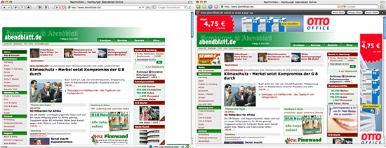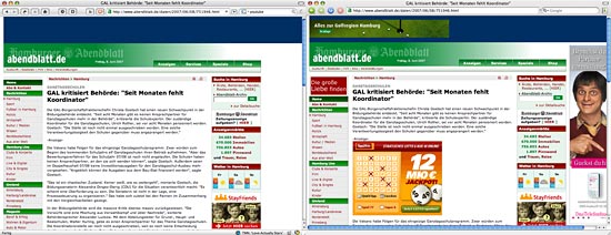 Mein absoluter Horror-Kandidat was Werbung anbelangt. Beim Abendblatt bin ich echt froh, dass ich Firefox mit Werbeblocker habe. Nicht nur, dass die oben und rechts Werbebanner haben. Zwischendurch wird ebenfalls so manche Werbung geschaltet. Plus: Camino zeigt noch an, dass ein Pop-Up unterdrückt wurde. Geht gar nicht. Sehr schön auch immer die traumhafte Farbkombination Rot trifft auf Grün. *schauder*