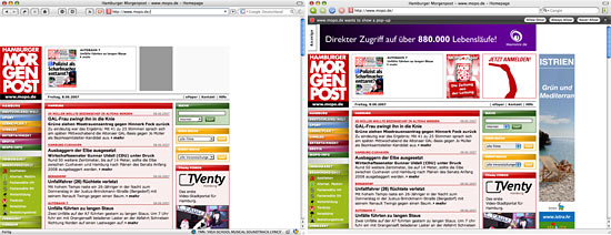 Bei der Hamburger Mopo finden sich die mittlerweile typischen Skyscraper und auch ein Banner ganz oben über dem Inhalt. Hat man jedoch die Werbung mit Adblock Plus ausgeblendet, dann bleibt hier der Platz mit der Werbung leer. Er wird nicht, wie z.B. bei der SZ vom Inhalt der Seite eingenommen. Es entsteht eine Lücke.