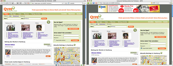 Beim Bewertungsportal Qype gibt es nur einen Werbebanner am Anfang der Seite. Dieser verschwindet und der Inhalt rutscht nach oben. So wirkt die Seite der Hamburger noch aufgeräumter. Bei solchen nichtkommerziellen Seiten ist es zwar schade, dass die Werbung unterdrückt wird — daraufgeklickt hätte ich aber eh nicht…