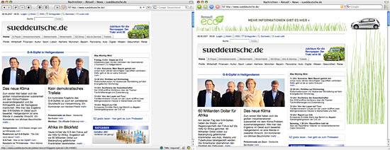 Die Süddeutsche hat ebenfalls Werbung geschaltet. Diesmal auch kommerzielle. Was auffällt: Bei der SZ haben wir neben dem Skyscraper am rechten Rand auch ein dickes Banner, das sich oben über dem Content erstreckt. Mit Werbe-Blocker ist nicht nur das Banner weg, sondern die Seite rutscht auch höher. Das ist nicht immer so.