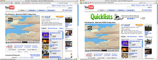 Dazu muss man nur einmal an einen anderen Rechner gehen (oder einen anderen Browser benutzen) und schon erscheint YouTube anders: mit Werbung. Okay, bei YouTube ist nicht wirklich kommerzielle Werbung geschaltet, aber als ich das Banner oben zum ersten Mal sah, war ich doch schon erschrocken. Stimmt ja, Adblock blendet Werbung aus. Na, dann wollen wir doch einmal einen Vergleich anstellen. Wie schaut eine Seite mit und ohne Werbung aus? Auf den folgenden Bildern ist der linke Screenshot aus Firefox heraus aufgenommen, der rechte aus Camino (ohne Werbeblocker).